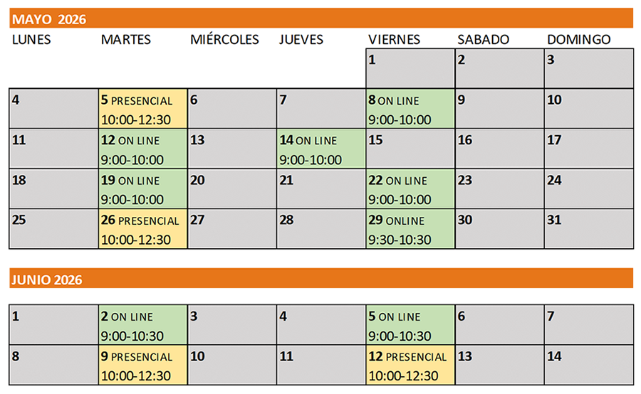 • Presenciales: 5 y 26 de mayo; 9 y 12 de junio (10:00 a 12:30)